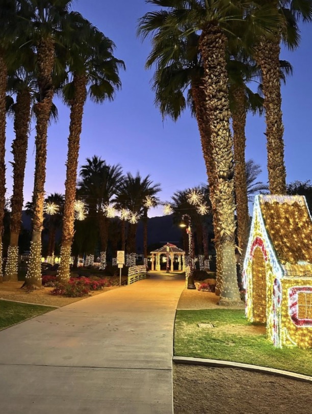 Beautiful any time of year, this park next to La Quinta City Hall truly comes alive in December, when all 17.5 acres glimmer with merry lights. The charming esplanade makes for an enchanting evening stroll, with pathways that wind over twinkle-lit bridges, beneath canopies of glittering snowflakes, and past towering palm trees and glowing, larger-than-life holiday vignettes—offering a delightfully desert-flavored over-the-river-and-through-the-woods experience.