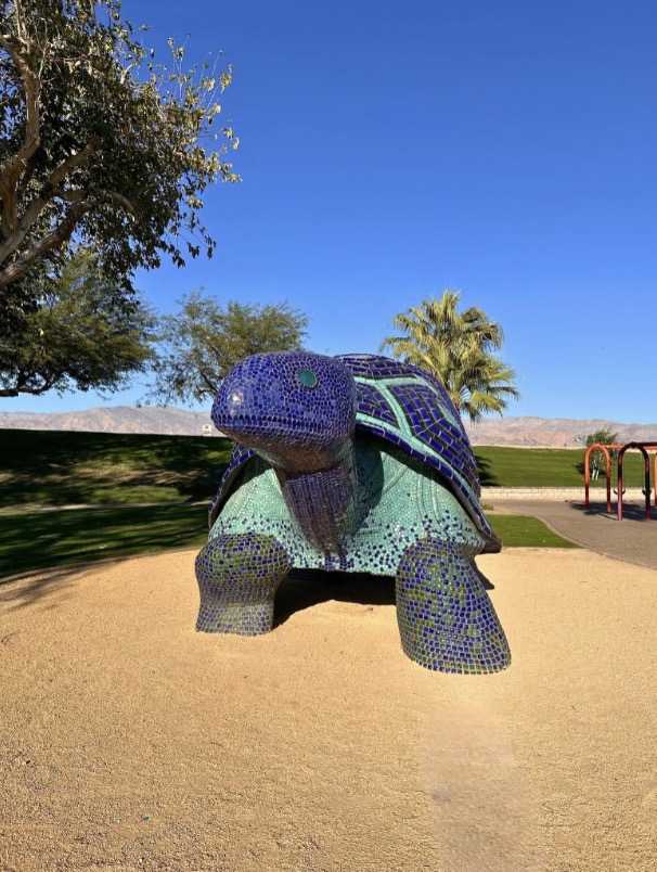 Turtles are my favorite animal, so this charming new sculpture on display at North Jackson Park in Indio holds a special place in my heart. Created by artist Peter Hazel, the 20-foot-long tortoise is fashioned from recycled glass and handmade ceramic tiles in rich purple and teal hues. With its friendly expression and piercing cerulean eyes, the mosaic reptile seemingly watches over its grassy surroundings, inviting parkgoers to pause, explore, and bask in its sweet presence.