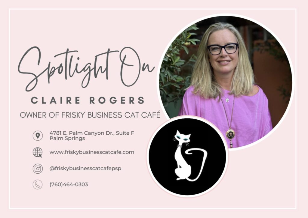 As a proud self-proclaimed crazy cat lady, it should come as no surprise that Palm Springs’ Frisky Business Cat Café is one of my ultimate desert happy places! The first and only of its kind in the Coachella Valley, the cat-centric coffee house was established by Claire Rogers and her husband, Sonny Von Cleveland (aka Mr. and Mrs. Frisky) in December 2022. Nearly three years and 142 adoptions later, it stands as one of the desert’s greatest feel-good success stories. So I’m absolutely thrilled to be spotlighting Claire in this issue!