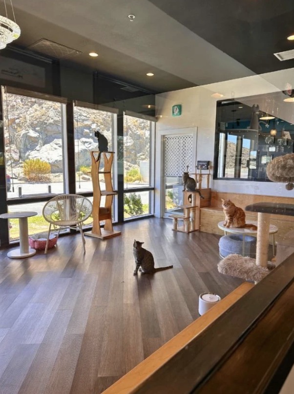 Guests book a session in the cat lounge to spend time with the cats. I speak with each potential adopter to understand what they’re looking for, then offer guidance on which cat might be the right fit. The process involves a one-page application, which we handle on behalf of the Palm Springs Animal Shelter. We collect the shelter’s adoption fee, submit all paperwork, and the adopter gets to take their new furry family member home directly from Frisky Business.