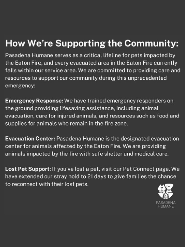 I lived in Pasadena for 13 years and in that time adopted several cats from Pasadena Humane, so the organization is very near and dear to my heart. Following the Eaton Fire, the facility took in hundreds of displaced and injured animals and is currently in need of monetary donations as it continues to provide emergency services and shelter. Locals who come across injured wildlife can text the society for assistance at (626)344-1129. For help with all other animals, contact animal control at (626)792-7151 ext. 970.