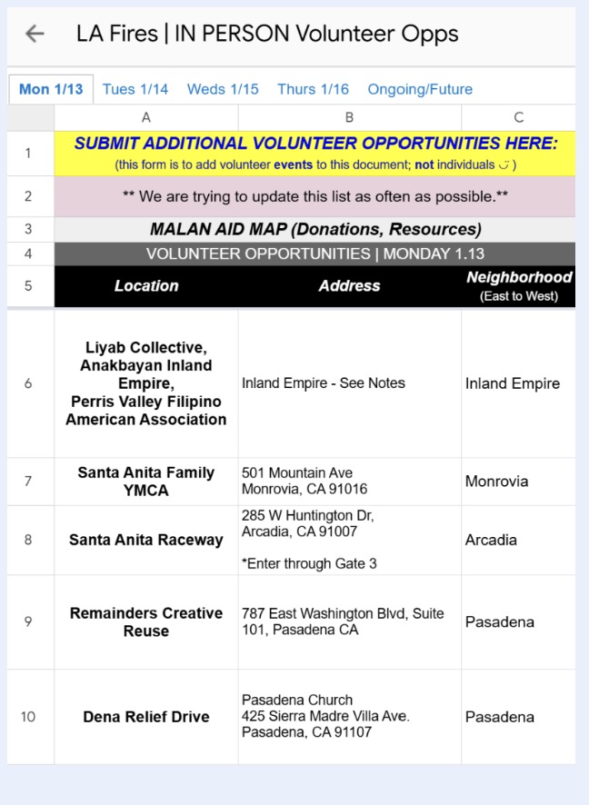 Looking to volunteer? Mutual Aid Los Angeles Network has you covered with a detailed spreadsheetchronicling daily volunteering opportunities across L.A. County. Updated regularly, the list catalogs countless ways to offer support, from sorting through donations at various dropoff centers to transporting goods to local shelters to translating opportunities. Organizations needing volunteers can also submit requests via the same document.