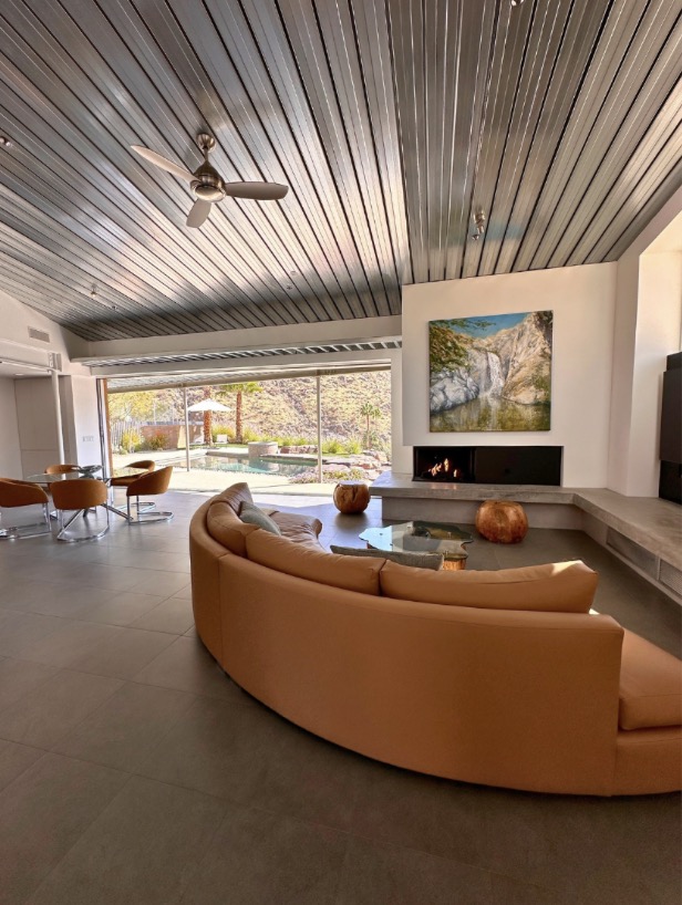 This butterfly-roofed architectural marvel stands seemingly miles above the Valley, overlooking nearly all of Palm Springs. Completed in 2007, the 3,200-square-foot property was crafted entirely of steel, glass, and stone, with sleek angles showcasing dramatic 360-degree views at every turn. Designed for entertaining, disappearing walls of glass open the ample double-island kitchen and dining area to the rear yard, a lush space featuring a pool, spa, fire pit, exterior kitchen, grassy expanse, and sparkling waterfall.