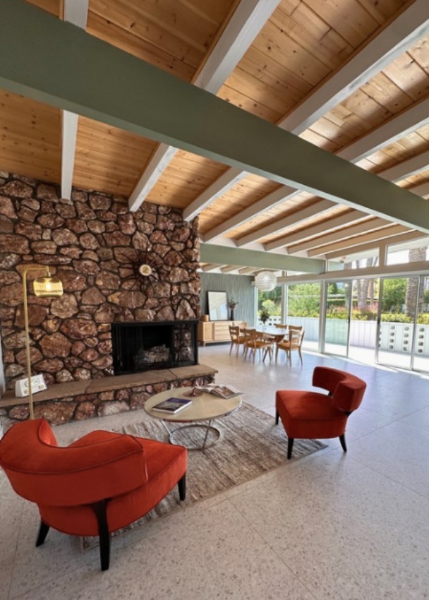 Exquisitely restored by its present owners, this 1958 William Krisel-designed pad looks straight out of a magazine! Tucked away in the historic Tamarisk Ranchos community, an idyllic resort-style enclave of 16 midcentury homes surrounding a pool, pathways, and grassy expanses, the residence is a stunning blend of original and modern, with beamed ceilings, travertine flooring, and rock walls flawlessly complementing such updated creature comforts as frameless glass showers, high-end appliances, and floating cabinetry.