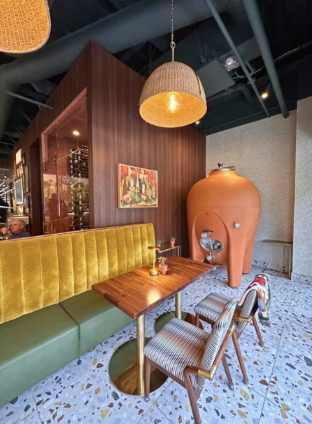 This El Paseo staple, elegantly appointed by Sophie Goineau, features a thoroughly modern take on midcentury design. With a look inspired by the exquisite stylings of the Sunnylands Estate and the Elrod House, the interior boasts plush banquettes, terrazzo flooring and marble counters, all sporting a warm pistachio hue, alongside recessed planters, Herman Miller sconces, and floating walls, making the restaurant’s aesthetic as appetizing as the fare!