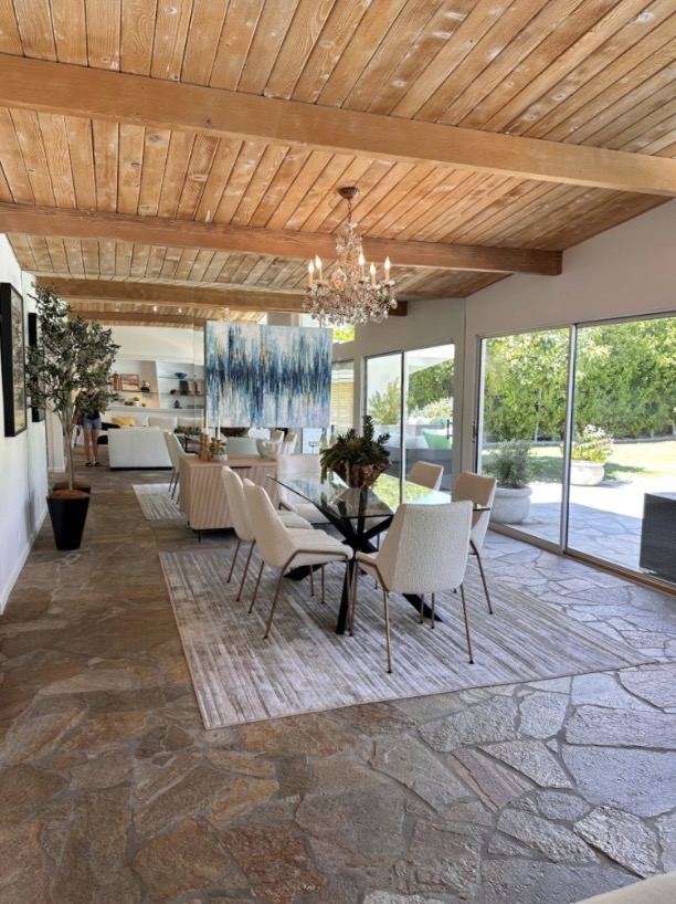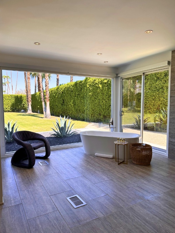 This 1974 Indian Canyons gem formerly belonged to Fess Parker, aka television’s Davy Crockett, who mainly utilized it “to entertain friends and as guest quarters for his big family,” according to a 1990 Desert Sun article. Recently overhauled, the 2,100-square-foot space is a sleekly polished retreat today, outfitted with luxe creature comforts, fine finishes, and an oasis of a backyard, measuring almost half an acre! But the home’s real standouts, as highlighted in a 2020 Palm Springs Life spread, are the primary bath (pictured) and powder room, both dramatically framed in glass, pristinely showcasing the spectacular grounds.