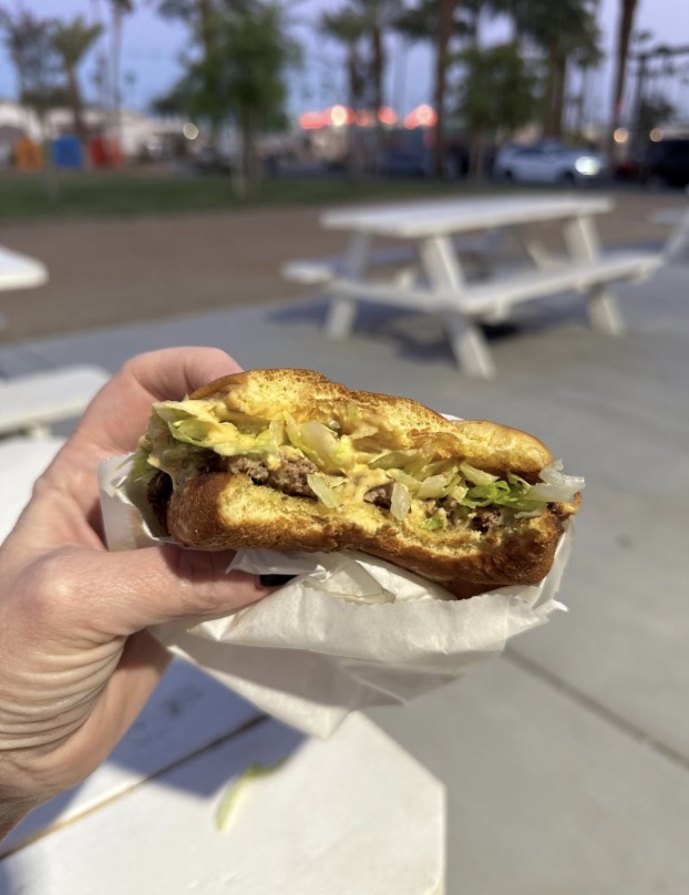 In search of a scrumptious burger? The popular Papa Headz food truck is now operating out of the walk-up window at Gabino’s Creperie in downtown Indio, with promises of offering “California’s #1 Burger and Fries.” And that lofty pledge is not hyperbole! Pristinely sized with everything freshly made on-site (you won’t find any frozen ingredients here!), the patties are smashed, crisped, and topped to perfection! They’re so tasty – and tasty-looking! – in fact, I dove right into mine as soon as it arrived – before I even had a chance to snap an appropriate photo, hence the half-eaten burger pictured. The fries are also not to be missed!